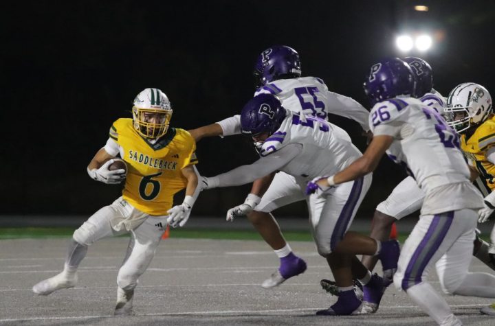 Saddleback’s Fabian Bravo gains yards in Friday’s CIF playoff opener. (Photo courtesy Christopher Leon)....